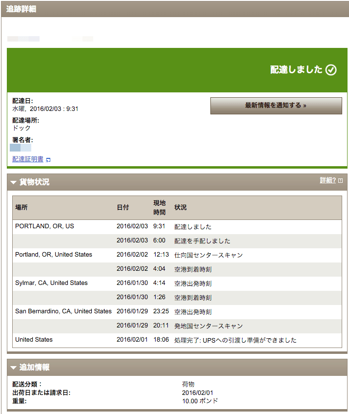 荷物を追跡したイメージを両方ともアップしておきます。