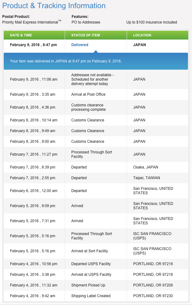 - 2/5(日本時間): Spear netからEMSトラッキングナンバーが載った「発送完了のご連絡」メールが届く。